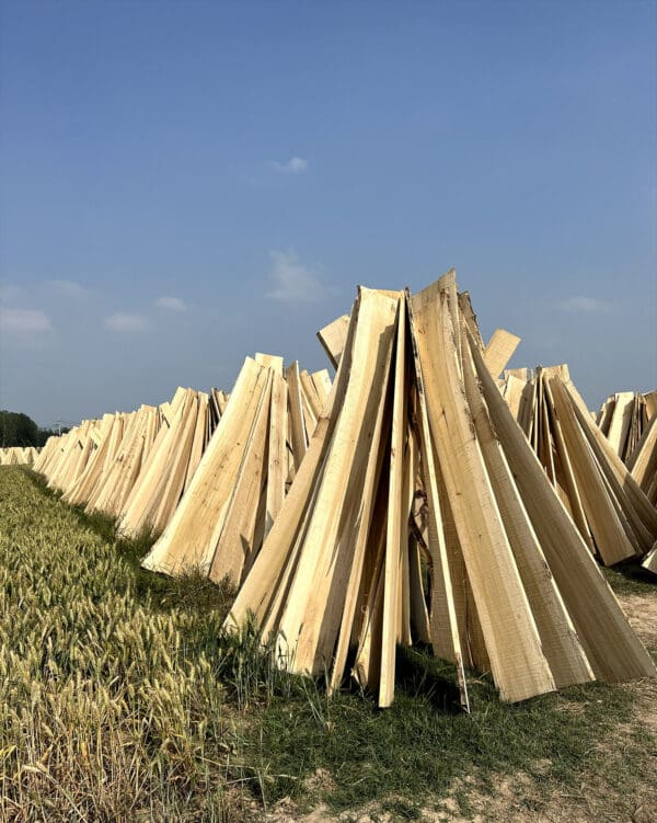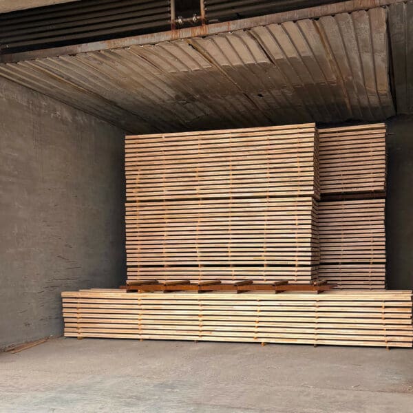 The freshly cut logs are first cut into large planks and carefully stacked in teepee-like structures for the initial drying phase. Following this, the planks are transferred to a kiln, where they are dried for up to 4 days. Once fully dried, the planks are milled and ready to move on to the next phase of the manufacturing process.